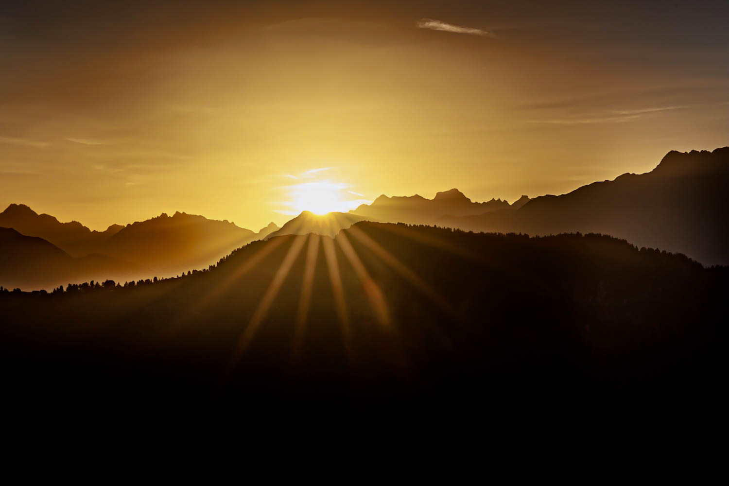 Du wartest. Die Dunkelheit weicht einem tiefen Blau, das sich langsam in zarte Violett- und Rosatöne verwandelt. Dann, am Horizont, kündigt sich das Spektakel an. Ein erster, gleissender Strahl bricht durch die Wolken und schickt lange, goldene Lichtkegel über die dunklen Hänge der Berge.